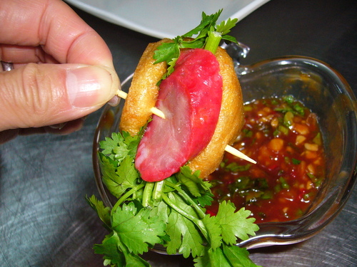 2011/12/03 傍晚時分來到五結宜蘭餐飲推廣協會, 今晚我們要用宜蘭特色美食鴉賞及在地生產的宜蘭好米, DIY 鴉賞米漢堡做為我們的晚餐, 享用宜蘭特色晚餐. 桌上有盤開胃菜很特別, 以前沒看過也沒吃過, 工作人員說這是宜蘭特色小吃 "一串心", 沾醬後真是美味! 要給它推! 推! 推!