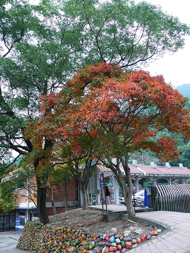 石門水庫南苑停車場是很個很特別的地方, 初冬第一個寒流過境後, 在這裡可以看到整排紅色的楓樹, 整排黃色的茄冬, 整排綠色的橄欖 (橄欖樹上還結實纍纍). 坪林收費站旁的坪林公園口有顆火紅的楓樹, 是最吸睛的一棵楓樹, 一定不可錯過.