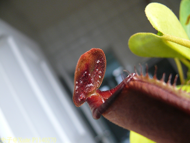 食蟲植物-豬籠草 N. lowii x truncata (母本 lowii x 父本 truncata), 母本 lowii (勞氏豬籠草) 原生地產於婆羅洲海拔約 1600至 2600公尺山頂土地貧瘠的地區, 它的籠蓋內側則會分泌白色甜度很高的糖霜, 但種在台灣, 怕熱是它的缺點. 為了讓 lowii 能在台灣種植, 育苗專家都會選用耐熱的父本進行交配, 產出台灣可以順利種植的品種. lowii 交配種的迷人之處在於它的籠蓋內側則會分泌白色甜度很高的糖霜, 而籠體會因父本的不同, 產生不同的形狀的籠體, 趣味的變化令人著迷.