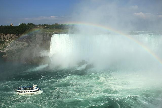 Niagara Falls的名稱源自印第安語,意為「雷神之水」,平均流量每分鐘高達14萬立方公尺,聲勢浩大無與倫比。