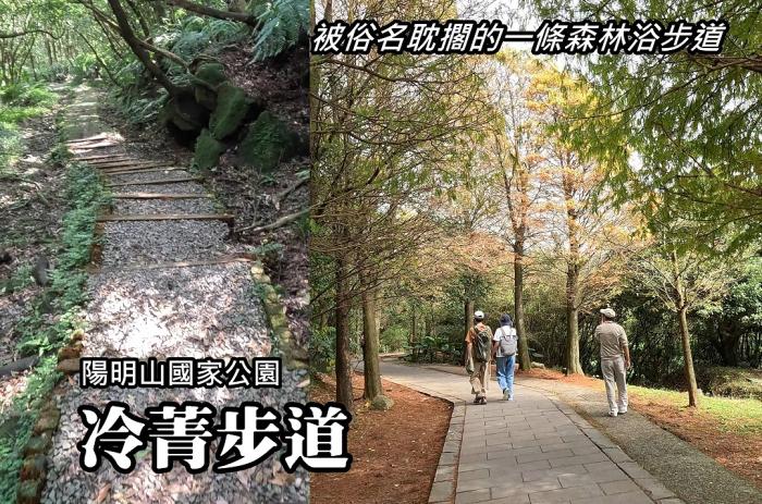 陽明山國家公園冷水坑遊憩區,以菁山吊橋、牛奶湖、生態池等景點著稱。附近有一條步道通往菁山自然中心,長約1.6公里,屬於「環七星山人車分道」的一段,步道大致沿著菁山路101巷, 是一條平緩好走的森林浴步道,我暱稱它為「冷菁步道」。