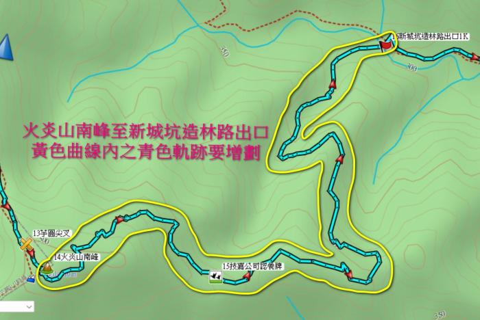 本日行程承蒙藍天隊前後連續三個星期的六、日包含今日共6個工作天才完成仁里坂山~火炎山東峰~火炎山~火炎山南峰~芋園尖~九芎根步道的稜線除草修徑任務!黃藤吃到飽的路線,真是辛苦!今日下到新城坑道路1K,藍天隊車隊整齊靠邊停車,真壯觀!