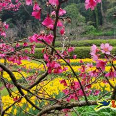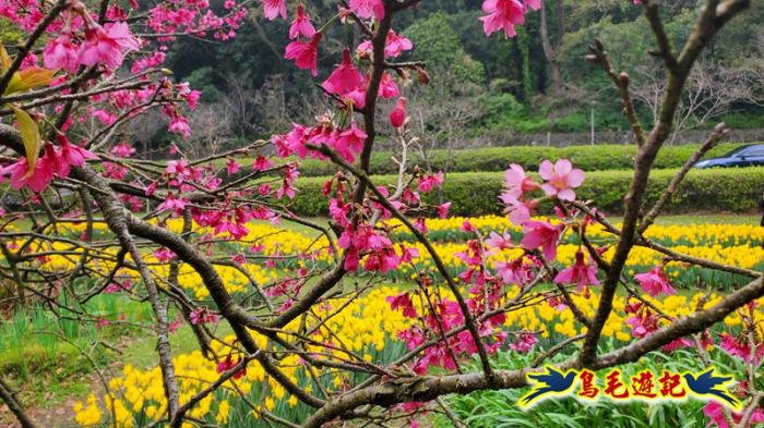 鄰近陽明山公車總站的湖山綠地公園,每年2、3月陽明山花季期間,有金黃西洋水仙花及粉色吉野櫻接力盛開,