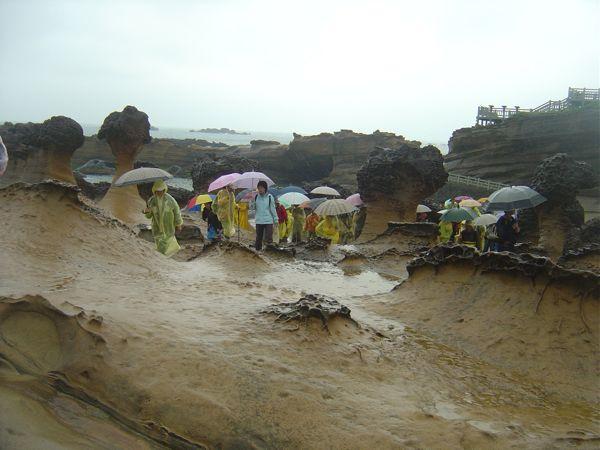 大夥兒一大早就到達野柳,整裝後進入探索,這一區的目的在了解蜂窩岩、蕈狀石、燭台石、薑石……的形成經過,並且尋找地面上的風化紋、海膽化石、生痕化石等,雖然細雨不斷,並不影響大家的興致。