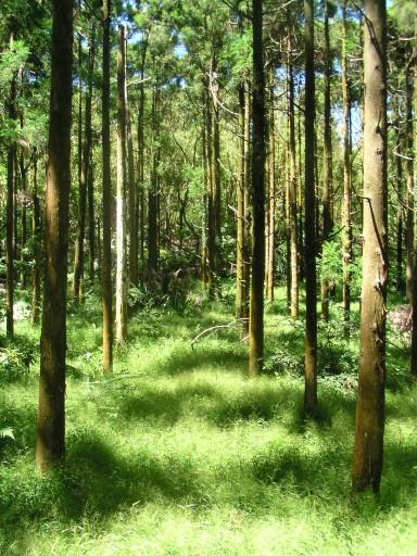 杉木林,地上長滿柔和的短草,加上光影的流轉,非常夢幻。
