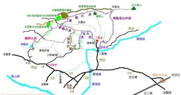 蓮華山,海拔215公尺,位於新竹縣新埔鎮三聖宮後方,無基石,無山頂標示牌。 進香古道,昔日茅埔地區往三聖宮進香道路,古道的前段為水泥路,為卵石步道。 迴龍古道,由三聖宮左側的龍頭登山口經蓮華山至龍尾,路旁有陸軍軍事訓練場。