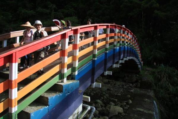 大夥兒在溪頭神木拍了團體紀念照之後,隨即進入「彩虹橋步道」,這條步道很短,由神木旁進入,至出口處大約有 330公尺,沿途都是木頭碎石子步道,十分好走,接近出口的地方有一座七彩拱橋,橫臥在溪流之上,色彩絢麗的彩虹橋,在青翠色溪谷中,格外醒目!