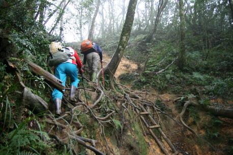為了能夠好好放心的登北插,我史無前例地去買了工作手套還有雨鞋和鞋墊,因為每次爬山看到資深經驗豐的山友幾乎都穿雨鞋,而網路上有關雨鞋與登山鞋的討論又幾乎倒向雨鞋,更增添了我穿雨鞋的決心。其實約是1999年吧,我跟一群朋友還有某團體去爬合歡山,我也是穿雨鞋,但腳走得很不舒服,這也是後來不是很願意考慮再嘗試穿雨鞋的原因。但後來發現,那次穿雨鞋我沒放鞋墊,而如今網路發達,多提到要加鞋墊,因此我還特地到LA NEW去買了厚鞋墊,這厚鞋墊要價350元,跟我買的加長型有束口的"高級雨鞋"同價,鞋墊真是貴而雨鞋真是便宜啊,大約只有登山鞋的十分之一而已啊。而實際走在當天小雨斷續持久的情況下,面對很長一段的爛泥,雨鞋真是王道,真的比登山鞋要管用得多,我想我的初體驗會讓我以後成為雨鞋一族,在天氣不好或是雜草叢生、路跡不明的山路,要改穿雨鞋。不過再次提醒,要放鞋墊進去,腳才不會不舒服,畢竟雨鞋的底只是一般塑膠,遇到尖石或是樹根還是不行的,這從有時鞋面碰到樹根會感到不舒服可以推知。