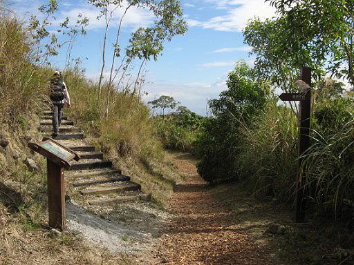 沒循正式步道入口上山,拐進一條產道,嚮導說方向正確,應該可以與步道交會。產道上一路沒遮蔽,氣溫近乎夏日,產道爬坡幾分鐘,便已汗流浹背。好在15分鐘左右,寬敞的木屑步道出現眼前,終於接上主步道。木屑像是才舖不久,沿途還有淡淡的木屑芬芳。