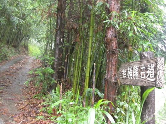 古道石階陡上約10分鐘,抵氣象局雨量計平台後,接續覆滿落葉平緩的泥土路。橫龍古道為昔日日人隘勇所闢,古道上可見過去隘寮舊址、石牆遺跡….等,沿途也設有人文環境解說牌。