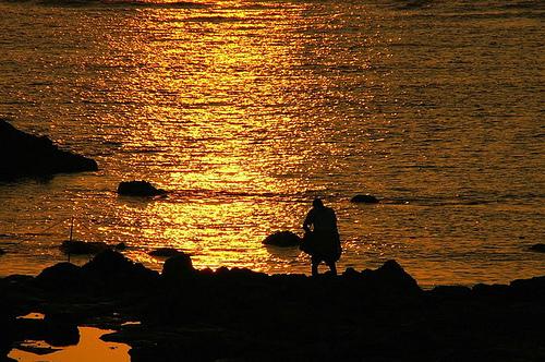吉貝極北方,遠眺目斗嶼燈塔,近岸處潮間帶都是石滬群,振文巧遇剛巡滬上岸的昔日友人,對於剛聽過石滬的歷史緣由的我們而言,無異看到一部活生生的歷史──今之古人?
