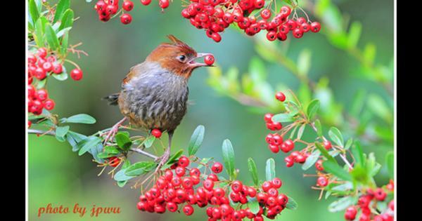紋翼畫眉為台灣特有種,全長約19公分,牠們不像白耳畫眉或冠羽畫眉常站在枝頭上覓食,比較方便拍攝時取景,通常牠們出現時,會從狀元紅旁較高的樹上直接飛進枝椏間,並在其間跳躍找尋適合的果子,在這種情形下,當日想拍得紋翼畫眉完整的身形,似乎不是件容易的事!