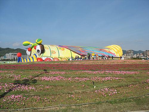 色彩鮮艷的行動巨蛋毛毛蟲,為因應行水區安全,被設計成可以快速拆卸及組裝,可容納1500名觀眾,是花博所有展館中容量最大的。