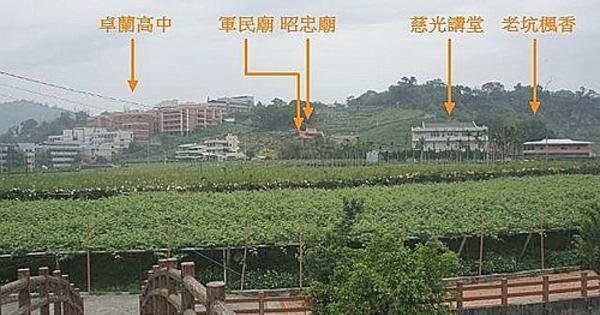 穿越 老坑楓香旁小巷弄接上馬路,頗負盛名的 軍民廟出現了,這是一座規模同 土地公廟大小的小廟。實際上祂應該算是大墓塚或萬善祠,廟後立有以 劉少斌將軍為主的數十座墓碑[圖4];這些墓碑籍貫地以 楚南為主,兼有其他省份,為 清末協助「開山撫番」政策派遣來台的 湘軍。