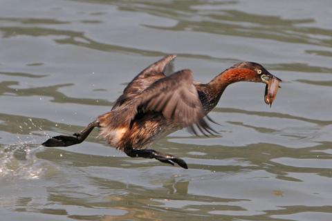 廣興泥鰍超多,每當抓到泥鰍的小鸊鷈從水裡起身時,總會遭一旁同類覬覦,一幕幕水上追逐的戲碼就不斷上演。小鸊鷈在寧靜湖面激起浪花的水上飛畫面,是鳥友們亟欲捕捉的鏡頭。