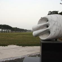 看到那一大片似無邊際的綠草地,我也就不想再騎了,讓常常盯著電腦的眼睛也能偶爾把焦點放遠到遠方綠意。廣場邊有藝術雕塑,稱之為「大地樂章」;其中一個像是海螺,又像是陶笛。不過當然還是那無邊的綠地與兩排往前延伸的大樹,創造了許多想像空間。國內大學校園綠草地應該沒有比這還大的