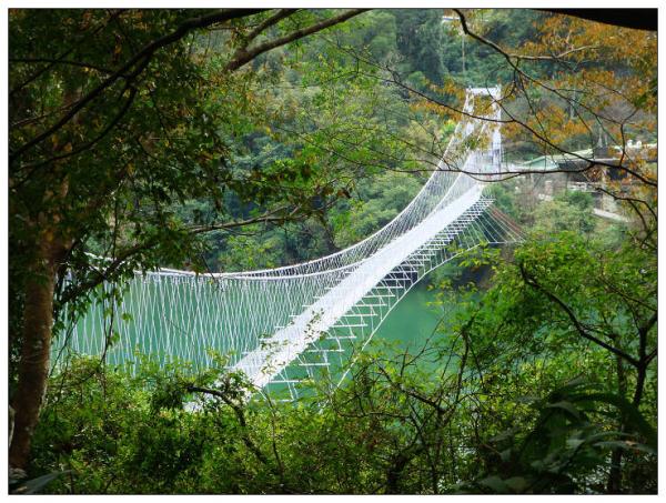 林中窺見白色鮮明的溪口吊橋,懸掛在青山綠水之間。