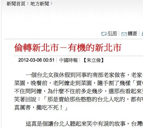 日前收到一封好友轉寄的電子郵件,標題是「憨憨的台北人」,是一篇新北市朱立倫市長在報端發表,名為「倫轉新北市-有機的新北市」的文章,而表達的重點是推廣有機耕作,提供民眾健康的飲食。
