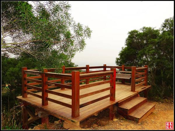 進入之後緩下坡,路徑寬大的土石路,兩旁的山坡相思樹迎風搖曳,不久到達下方的木造觀景台,設在步道旁的觀景台名為「無限台」,進入後稍作休息,看看風景,在觀景台上依稀可見之前從山谷間走過的旗開得勝步道。