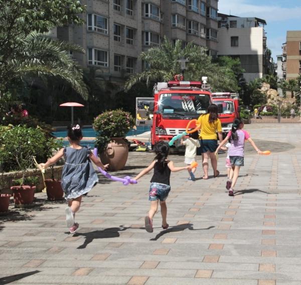 原來今天是本社區的年度消防演練,特地商請消防局動員大批人力,設置了11個消防安全宣導,與救火、逃生相關的解說站。