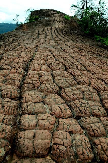 千龜山山頂裸露的紅色砂岩順著節理弱面被雨水侵蝕之外,還因為此地日夜溫差之故,導致較細部的砂岩塊也出現裂隙,在大裂隙(節理)與小裂隙(熱脹冷縮的裂縫)受到雨水不同程度的侵蝕下,形成如龜甲狀砂岩塊,有大有小、有方有圓,在丹霞地形多強調「大風景」的趨勢下,「千龜們」算是獨樹一格的「精巧景緻」!