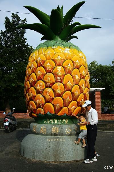 入口處果然就有個大鳳梨。這大潭埤公園有個好處,就是視野開闊,但湖畔遍值綠樹楊柳又可遮蔭。美中不足之處或許是鄰近墓區,拍湖光山色中時總難避免不去照到墳墓