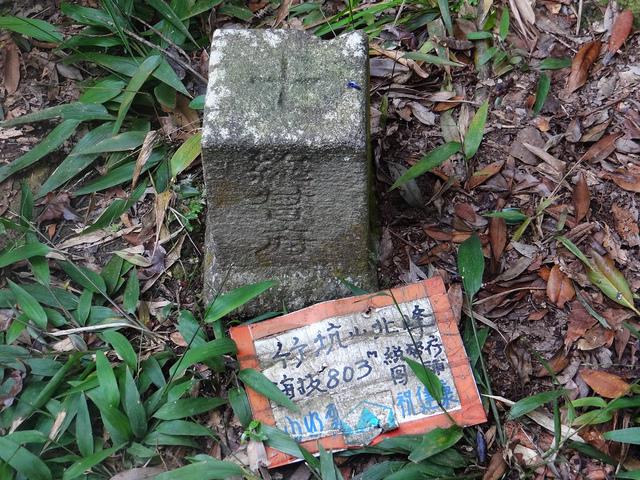 起初路況都還不錯,樹林間的稜線土路空曠好走,緩坡先下後上後抵鞍部。接下來是垂直陡下段,落差至少有50公尺以上,必須手腳並用,小心謹慎,攀繩而下,踏點不好須借力使力,採面壁倒退方式。從竹坑山到竹坑山北峰約35分鐘,此處有一顆「總督府」圖補基石,海拔803公尺,林木遮蔽視野不佳,時間已經2點40分了,開始憂心獨自1人可能受困山中,