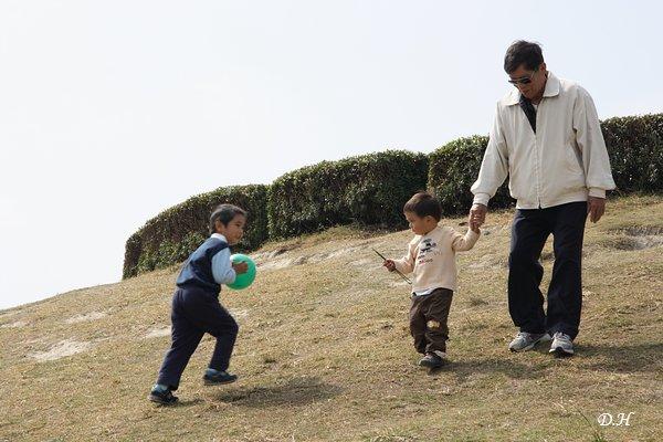 如此好天氣,我們便找地方遛小孩了。初時我想到鹿耳門天后宮有迎喜神活動;但爸媽說如果要找個地方讓小孩玩球,不如去林默娘公園。果然來到林默娘公園後,大型塑像下方的草坡,很適合玩丟球、踢球