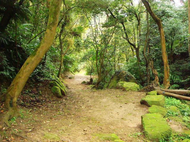 道別千年榕樹,從枕木階梯迎著細雨下來,目標便往北臨宮而去,山坡路陡下至叉路,右往中坑方向,沿溪而行。 中坑步道緩下,沿途多有竹林,古道幽幽沿溪行,腳步輕快。