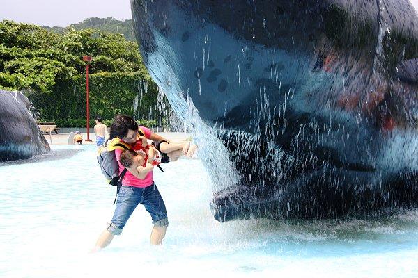 進到海生館後,兩小兒看到噴水的大鯨魚池,二話不說直接走進池裡頭玩水,很快的衣服褲帽全都濕了,也就任他們玩個夠了。後來老婆去販賣部買冰淇淋,回來時冰淇淋已經融化大半,可見這時天氣有多熱