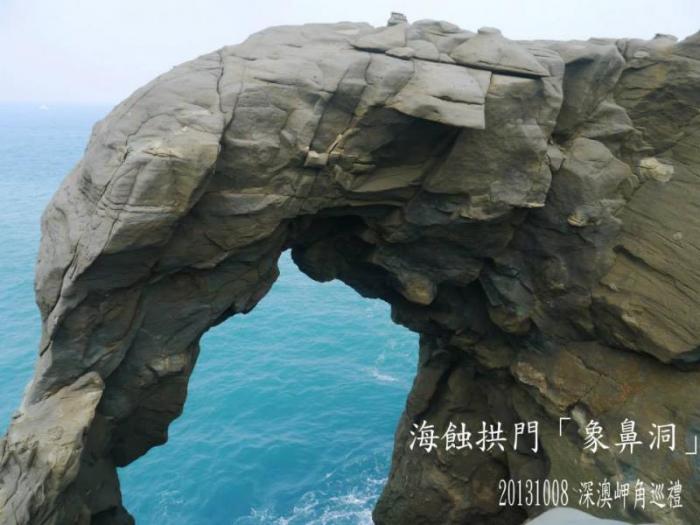 有隻海鳥,從海蝕拱門「象鼻洞」,若即若離靠近我,後來看到有釣客餵牠魚,原來牠把我當釣客,一直緊跟著,最後才放棄換人,深澳岬角地標,海蝕拱門「象鼻洞」,規模比石門洞還大,氣勢磅薄,頗值欣賞,許多千萬年才形成的『生痕化石』,於東滿步道會建成『生痕化石館』加以收藏,此處則任人踩踏,當成『止滑痕』真可惜了。