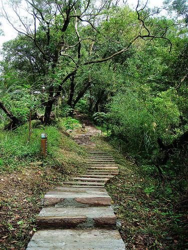 經過100/300M里程樁,原第一期步道往前下坡繞回登山口,而第二期步道由此開始叉路直行再往上爬,嶄新的石階步道,沿途綠意盎然,山棕、月桃花、蕨類植物、相思樹、還有油桐樹,將此新完工的步道,妝點的更為清幽雅緻。石階一路陡上,但見步道兩旁油桐樹高大,若是桐花時節再度光臨,羅曼蒂克詩情畫意自不在話下。