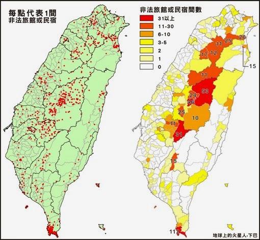 左圖是點子圖(無切確座標),每個紅點代表一間非法旅館或民宿,大家可以看到台灣中部山區有比較明顯的聚集現象,而北部的總量似乎較南部為多。右圖則是面量圖,轄下有越多非法旅館的行政區,其顏色越偏向紅色,可以看到中部山區一樣有明顯的集中。除此之外,還有個特別密集的地方,便是「屏東縣恆春鎮」,轄內有墾丁等眾多著名觀光景點的恆春鎮,其境內的非法旅館或民宿數目竟高達「112間」,勇冠全台!