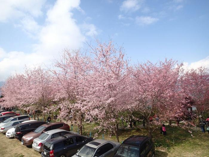 恩愛農場櫻花季,後面的產業道路還真陡,路況較差,到達停車場,門票費100元,往上走到櫻花處,櫻花盛開,很美,比中巴陵的櫻木花道還美,停車場旁櫻花朵開啟,上方路旁也有櫻花,還附設梯子給民眾在上面拍照,果然是很適合曬恩愛的恩愛農場