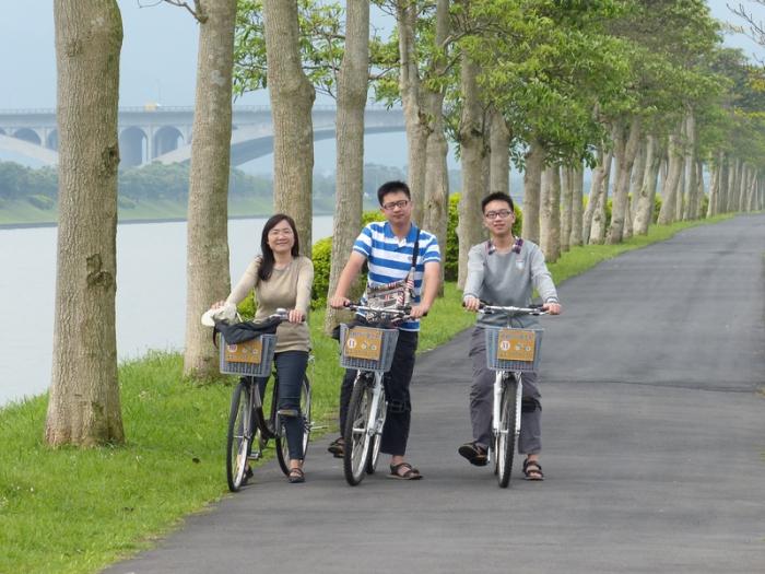 筆直漂亮的冬山河自行車道,空空蕩蕩,只有我們一家人悠哉閒遊!