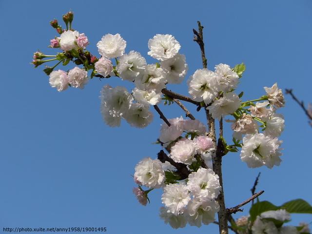 松月櫻花期4月中至四月底,桃紅色的花苞很豔麗,花蕊中心的雌蕊有一小嫩葉,初開為重瓣的粉紅色,花瓣20至30枚,大開整朵又轉變為純白。