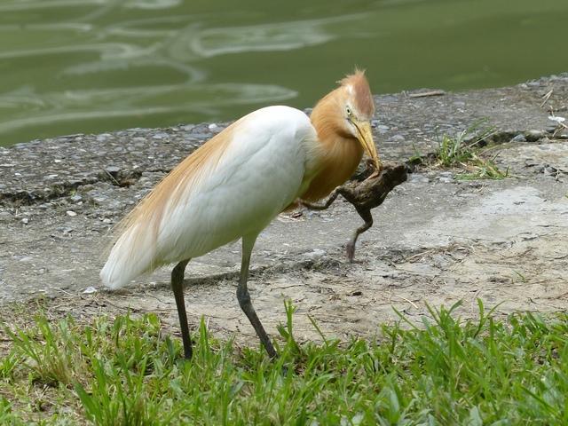 黃頭鷺嘴在碧湖畔尋尋覓覓,捕捉到一隻青蛙,美食當前怎能放過,以尖嘴戳刺青蛙的身體,直到青蛙奄奄一息,正要享受美食,突來2隻不速之客白鷺鷥,為了奪美食,左右夾攻黃頭鷺,黃頭鷺也不是省油的燈,使出展翅而飛,另求他處享美食。