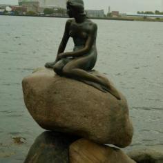 女農神噴泉景區,雨雖不是很大,但鏡頭沒防水,拍照較難,邊拿傘邊拍照也較難,拍完女農神噴泉,雖然很近,仍開車前往美人魚雕像景區,來到有名的丹麥美人魚,一塊大石頭上端坐著的栩栩如生的美人魚,訴說著一段哀怨動人的童話故事,她是一尊不是很大的銅像,稍微離遠一點兒,都看不清長什麼樣子的小美女,但到了丹麥不與美人魚合張影,就不算到了丹麥,和美人魚拍照還要搶位置,可見美人魚受遊客的歡迎程度,她是那麼的不起眼,如果不是專程來到這裡,一個不小心就可能被忽略了。