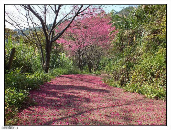 走進櫻花步道不久,就被天空及地上的「紅景」給迷住而沉醉。