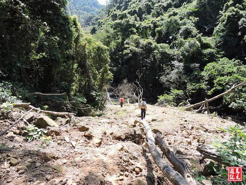 因之前颱風豪雨沖刷,造成整片山坡大坍方,原有古道路徑已不見,樹木隨著大量土石滑落堵住溪流,形成一處堰塞黑水潭,而這處因天災形成的黑水潭之中,竟然開出許多不同顏色的香水蓮(睡蓮),水潭上游處還有人持竿垂釣,真是奇哉!怪哉!