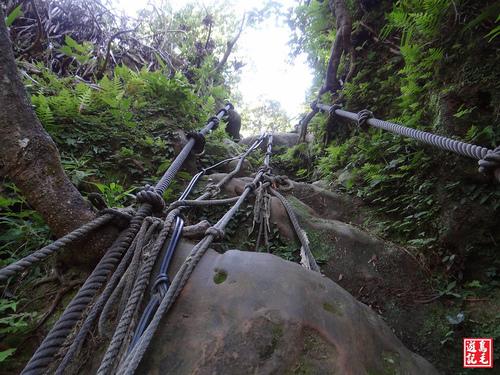 太陽很曬,迅速通過岩稜段,經崖壁缺口先直行數公尺登中央尖,山頂有一小空地稍有遮蔭,海拔580公尺,無基石。折回崖壁缺口,由此陡下落差至少2-3層樓高,不論是要從上頭下去或底處攀上都是很驚險刺激的,必須腳踏實地、膽大心細,