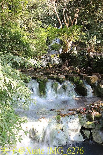 陽明山國家公園花季必訪,陽明山公園海拔445公尺,又稱為後山公園,原址為日治時期大正十二年 (1923) 山本炭礦株式會社創辦人山本義信所建的「羽衣園」(或稱為山本公園),1950年後為紀念明代大儒王陽明更名為陽明山公園。公園內遍植梅、櫻、桃、李、杜鵑、茶花等各種花卉,並有多座涼亭與水池,環山步道花木扶蘇綠意盎然,是一處漫步賞心的森林公園。陽明山公園西側一座直徑長達13公尺,民國58年 (1969) 正式開幕,歲齡超過50年的陽明山花鐘,是陽明山重要的地標,也是每年陽明山花季遊客上陽明山必訪、必合照留影的景點。公園東側目前整修中的噴水池與花鐘同齡,並稱為「陽明雙景」,一旁的小隱潭,小巧的磺溪沿石壁縫隙汨流而下形成瀑布,因硫磺沉澱,溪石上佈滿乳白沉積物,空氣中還飄散淡淡硫磺味,在蓊鬱林木包圍下,構成美麗圖畫。筆者(夫子) 看見水中乳白硫磺沉積,本以為水是溫的,用手碰觸發現溪水是冰涼的。上行順遊大屯瀑布,午餐 [湖山小鎮]。