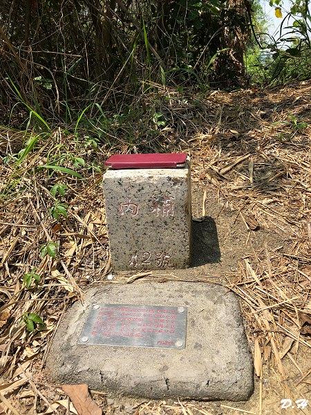 自從原來上稜的路被封了後,還沒再見過這顆基石。印象中三角點記號是畫在電線桿上,不過往下走了一會都沒發現,回頭重尋才在樹幹上看到。從邊坡小徑攀上稜線,再往前走一會,看到漯底山二等內補42號三角點