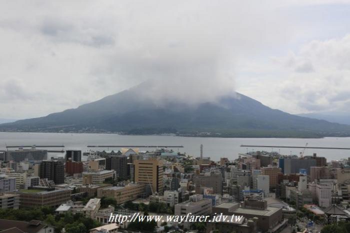 今天雖然是全部行李揹在身上,但幾段的小爬坡與昨天陡上開聞岳沒得比,要不是天氣太熱,實在是小菜一碟。況且步道平整,好走得很,甚且希望能有長距離可走,可惜很快便到了城山展望台。城山展望台海拔高度不高,山下視野風景只能算一般,但因能近距離望向櫻島活火山,因此不出名也難。可惜此時雲霧遮掩了櫻島的山頂,美景失色多矣。
