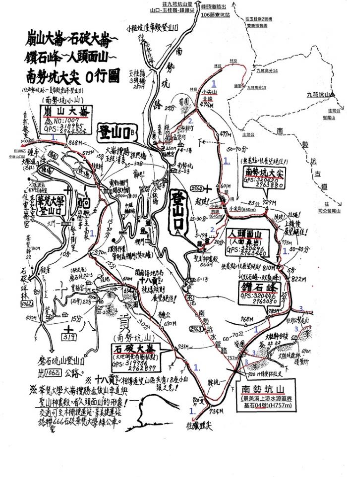 (一) 藍天隊(整闢獵狸尖至崩山大崙稜線)與聯合探勘隊 (整闢小尖山北峰至南勢坑山稜線)分工合作努力整闢, 終於打通此區大部分山徑,分別為: 1.小尖山北峰 小尖山前峰 小尖山 南勢坑大尖 人頭面山 鑽石峰 南勢坑山 獵狸尖 石碇大崙 崩山大崙主稜線山徑 已全部整闢完成(紅色路線) 2.三條登小