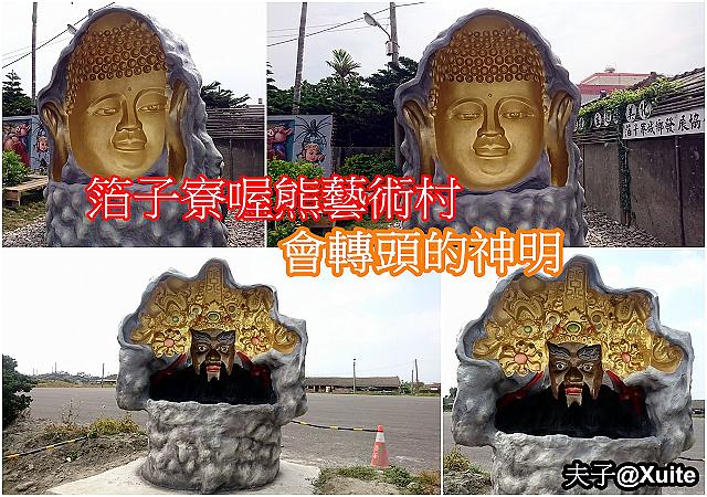 雲林縣四湖鄉「喔熊藝術村」(箔子寮臺灣好神3D彩繪村),彩墨軒工作室藝術家曾進成,繼完成全台第一座創造新形態的雙面彩繪 (彌勒佛 - 達摩,雙面畫) 後,又有新創舉!全台第一座凹雕裝置藝術,「會轉頭」的佛祖和溫府千歲,作品雖然是凹雕 (向內雕刻),但透過自然光線折射,產生視覺錯亂,看起來像是凸出來,變成立體效果。隨著腳步慢慢移動,佛祖的頭也會跟著轉動,有如佛祖凝視眾生,超神奇的!對於新的創作,曾老師還是以他一貫的謙虛,說 [我們的創作只是配角,每個您才是主角],這裡 [好拍不用錢,不好拍免費],歡迎您來玩。
