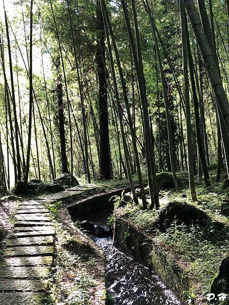 早晨陽光穿透竹林,參差灑落在步道與水圳中的淙淙流水,光彩奪目