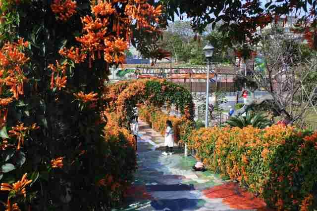 永吉公園因為三鶯線捷運而美化的公園,最近紅的景點,位在鶯歌區靠近桃園的邊界,其實從鶯歌車站去比較快,但我比較知道桃園客運總站的位置,所以從台北到桃園再轉車,5005公車走鶯桃路非常慢,因為捷運施工中,替代路線是鶯歌路,但公車仍是走非常塞的鶯桃路,所以龜速慢行,永吉公園站下車後,往回走到鶯桃路296巷,有機車停車位跟付費的汽車停車場,進入後先走右邊,有高架的炮仗花,雖然炮仗花是秋天開花,不過今年暖冬,開花有點難預測
