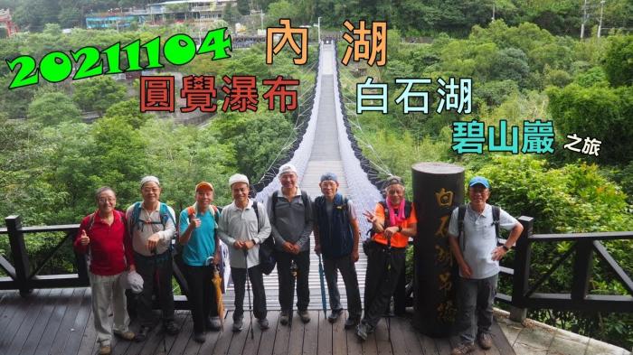 告別圓覺瀑布,續行圓覺寺步道,續往圓覺寺,途中又見石刻,來到圓覺寺了,圓覺寺前遠眺賞景,續往白石湖區,途中遠眺賞景,來到往白石湖區叉路口,稍歇一會,新地標來張合照,續行來到白石湖區同心池,同心池整理不錯,可惜鐵砲百合季節已過,無緣賞花,續往夫妻樹小逛一下,104年颱風吹倒夫樹,新植少夫,已粗壯不少,踏上歸程,經白石湖同心池,,來到白石湖吊橋處了,來一張到此一遊合照。