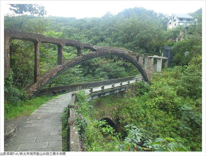 山尖路上最精華值得造訪的是橫跨於外九份溪上,由三座橋梁上下疊成的「三層橋」,上層是運水的水圳仔橋,中層則為目前的人行過往的水泥橋,下層是日治時期的人行石砌拱橋,三座造型相異不同年代的橋梁上下相疊,景象頗為特殊。